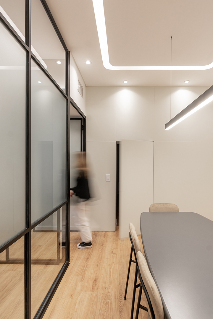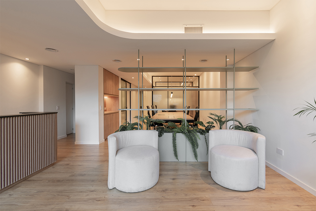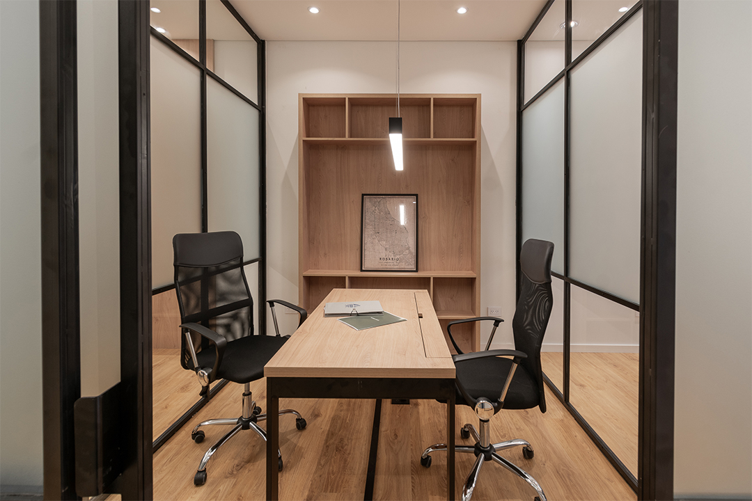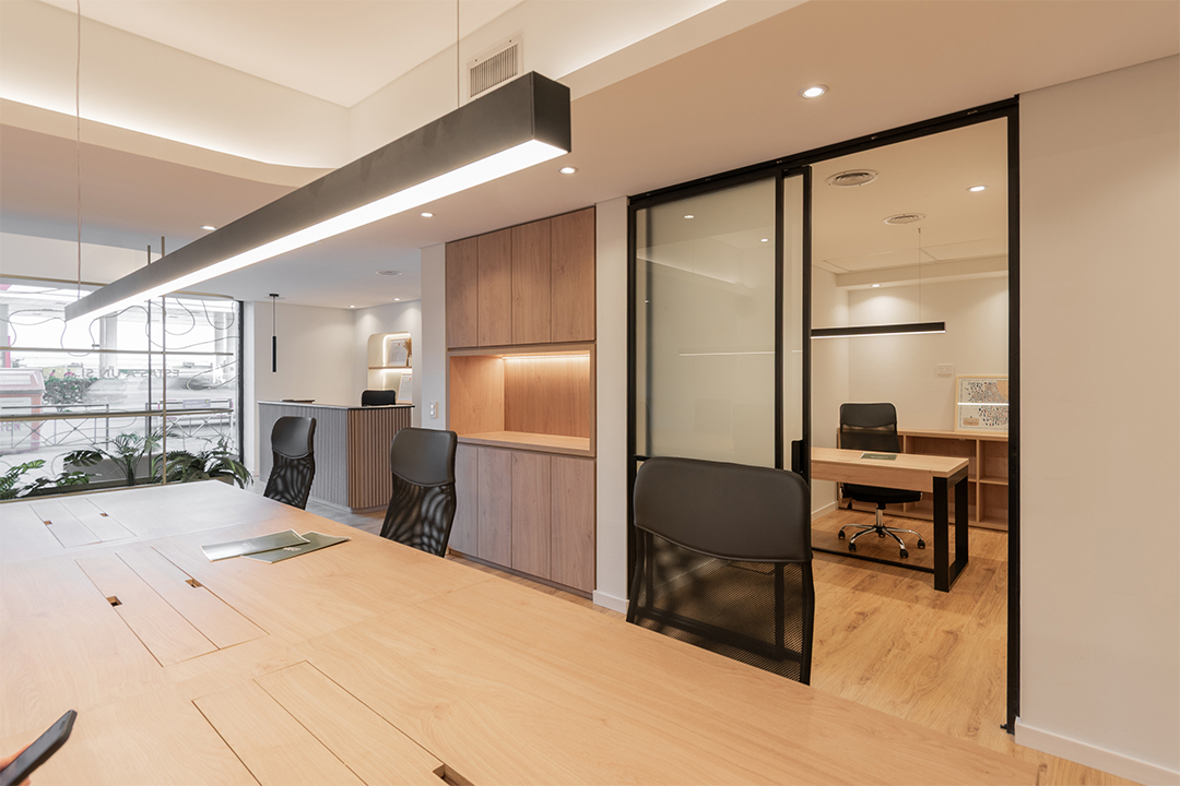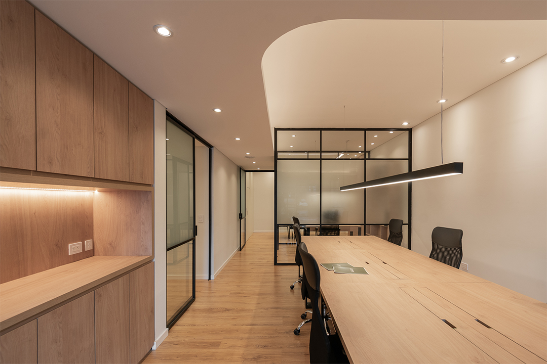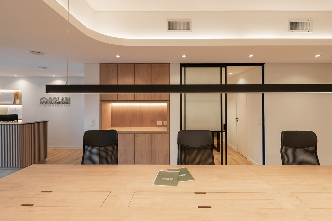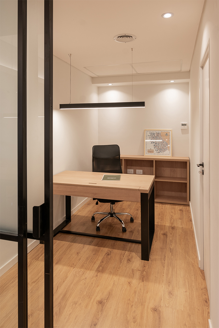 El proyecto se ubica en Pellegrini y Sarmiento, en un local de 105 m² que durante años funcionó como espacio gastronómico. La decisión principal fue vaciarlo por completo, conservando únicamente los muros de mampostería para generar un ambiente abierto y flexible. El acceso desde la calle conduce a una recepción, separada del área central mediante un mobiliario de chapa diseñado para dividir sin cortar la fluidez visual. En este sector se dispusieron una oficina privada y una sala de reuniones, resueltas como volúmenes de vidrio que aseguran amplitud y continuidad. El diseño buscó un espacio abierto con máxima atención al detalle, equilibrando funcionalidad y estética para crear un ámbito eficiente, contemporáneo y acogedor.