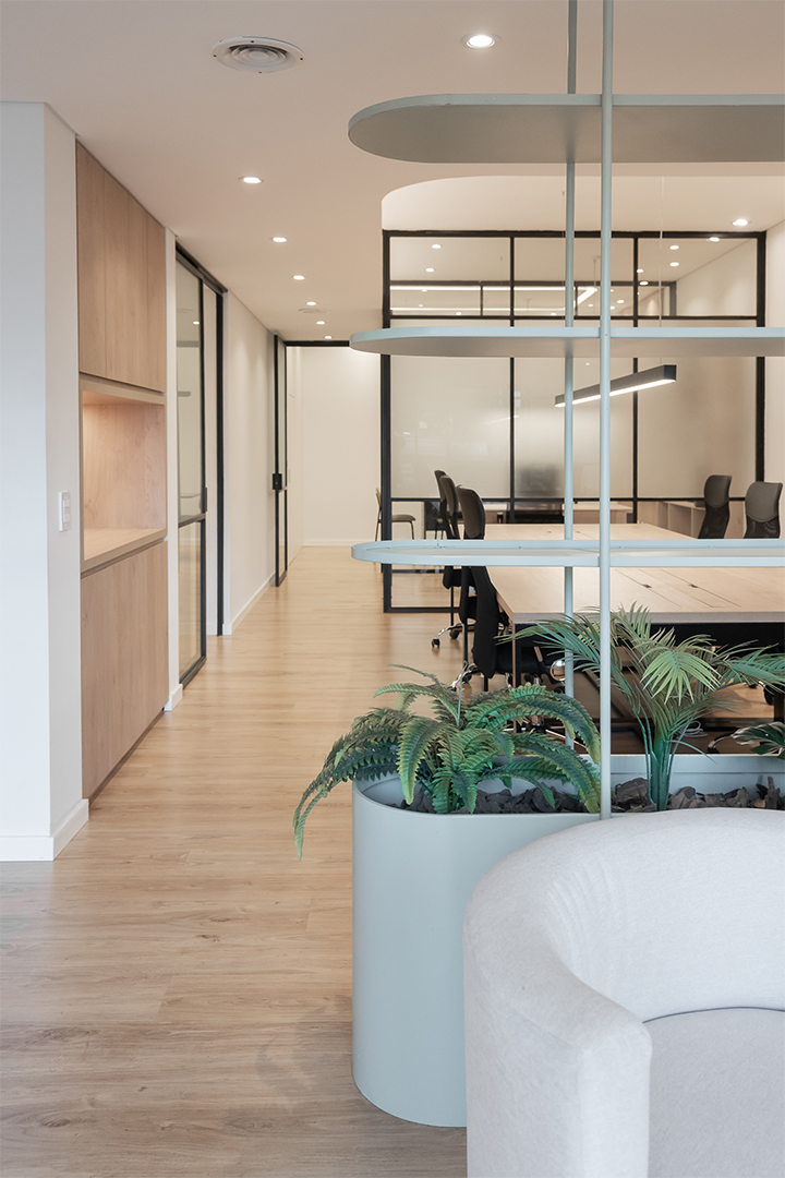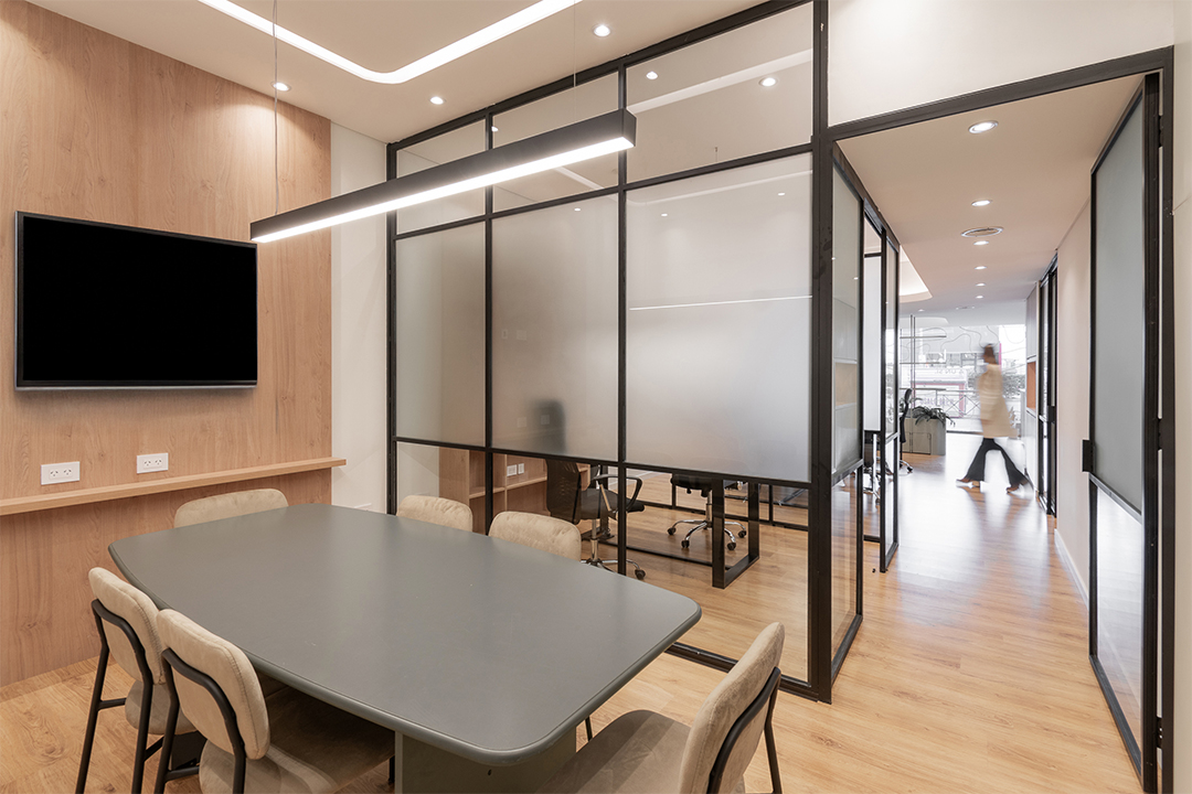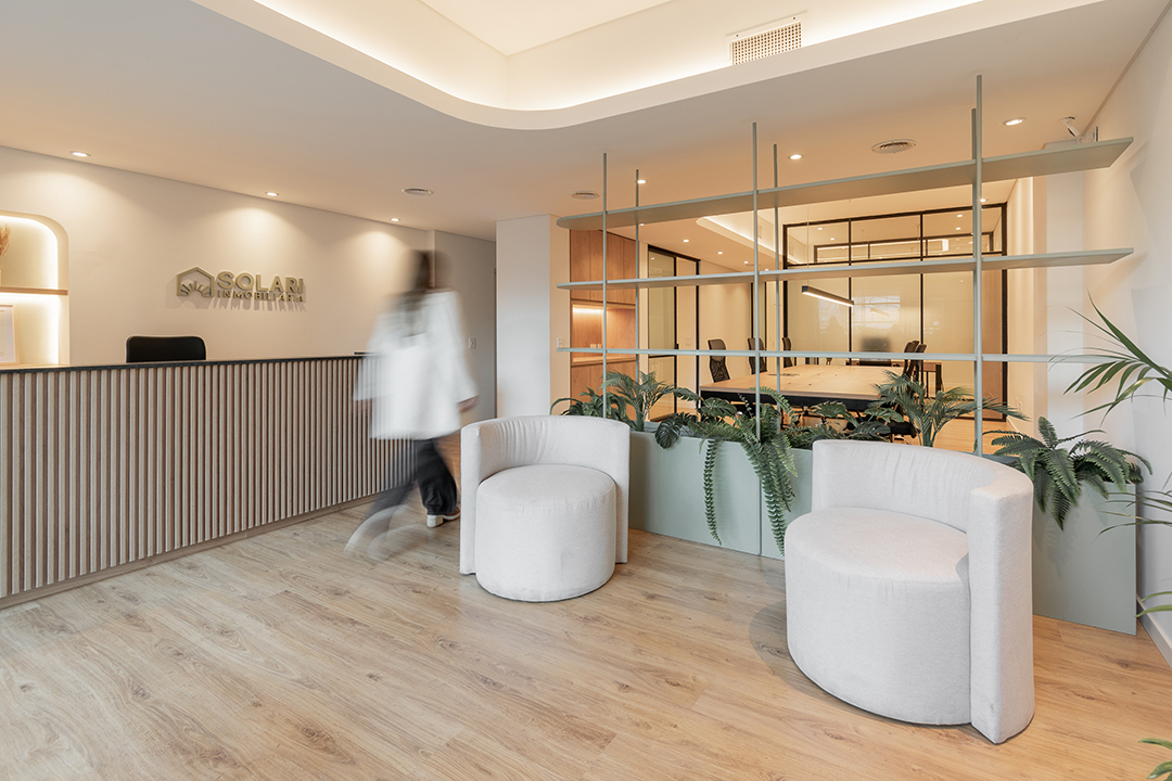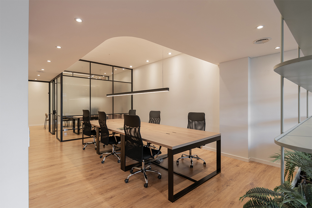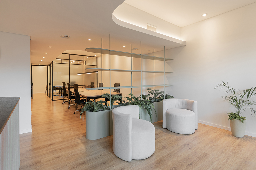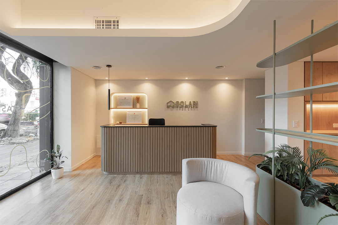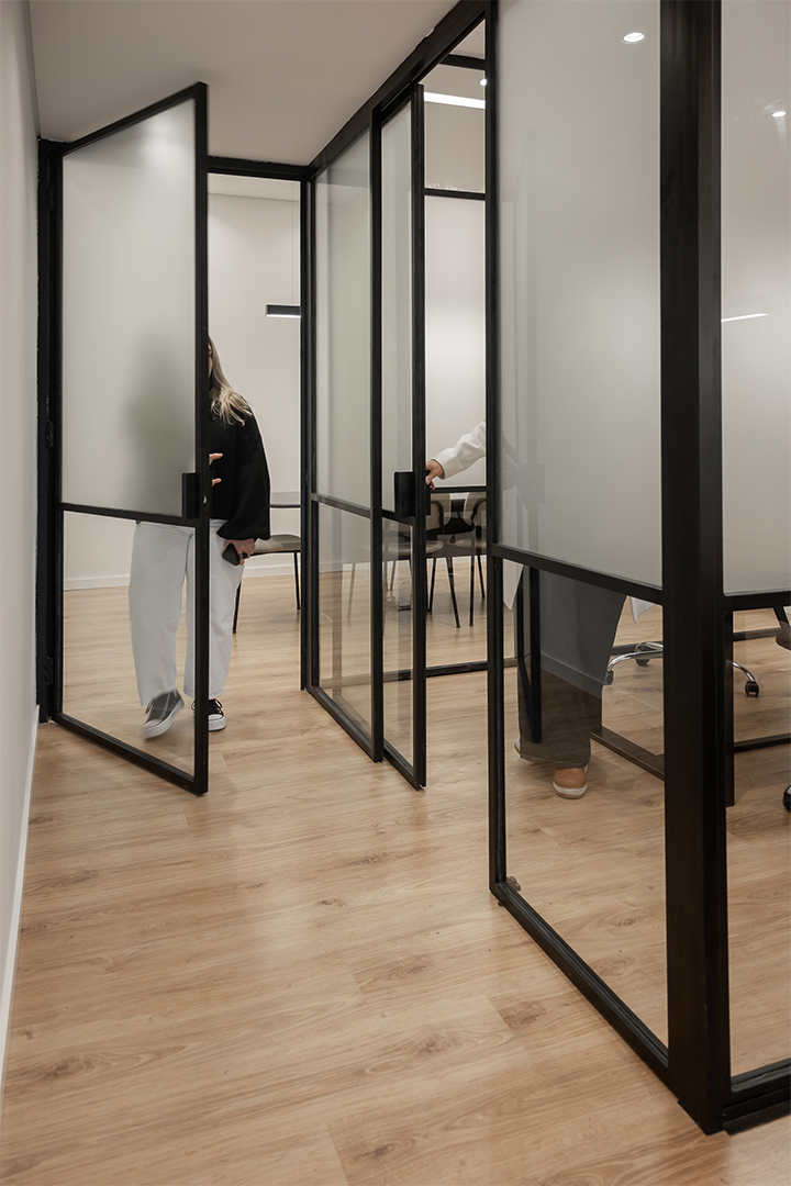 El proyecto se ubica en Pellegrini y Sarmiento, en un local de 105 m² que durante años funcionó como espacio gastronómico. La decisión principal fue vaciarlo por completo, conservando únicamente los muros de mampostería para generar un ambiente abierto y flexible. El acceso desde la calle conduce a una recepción, separada del área central mediante un mobiliario de chapa diseñado para dividir sin cortar la fluidez visual. En este sector se dispusieron una oficina privada y una sala de reuniones, resueltas como volúmenes de vidrio que aseguran amplitud y continuidad. El diseño buscó un espacio abierto con máxima atención al detalle, equilibrando funcionalidad y estética para crear un ámbito eficiente, contemporáneo y acogedor.