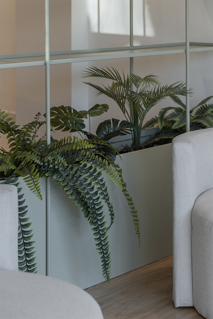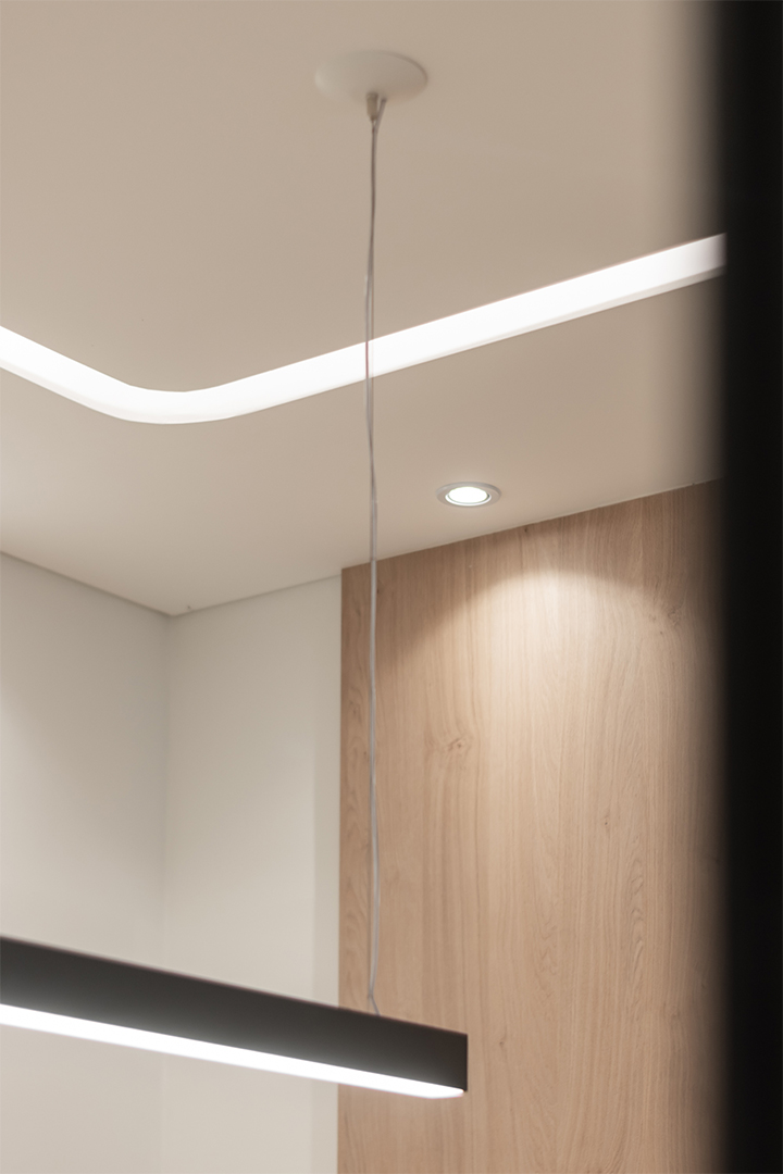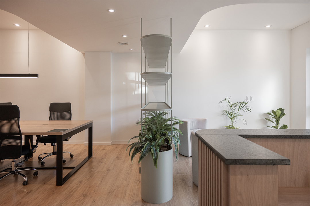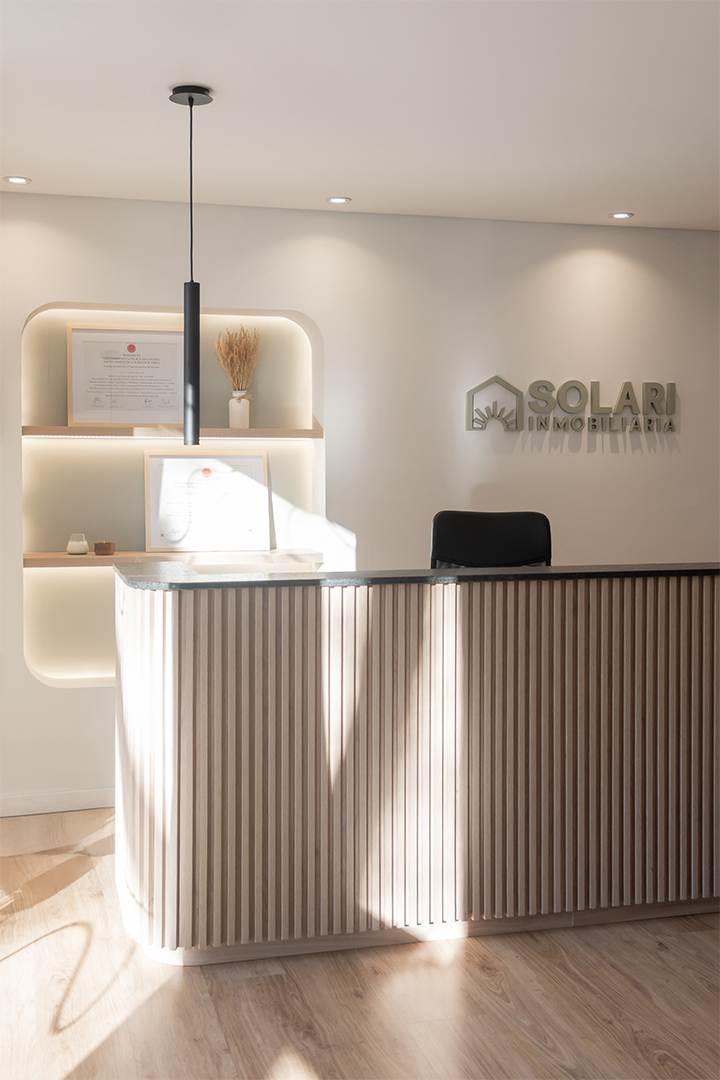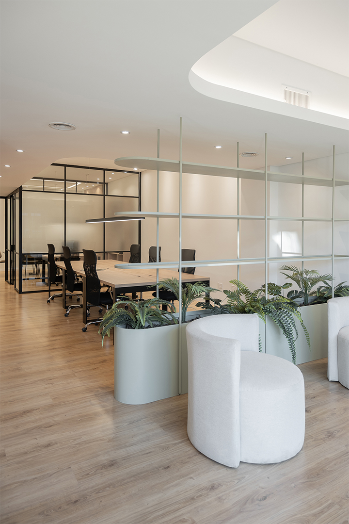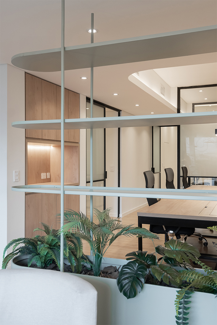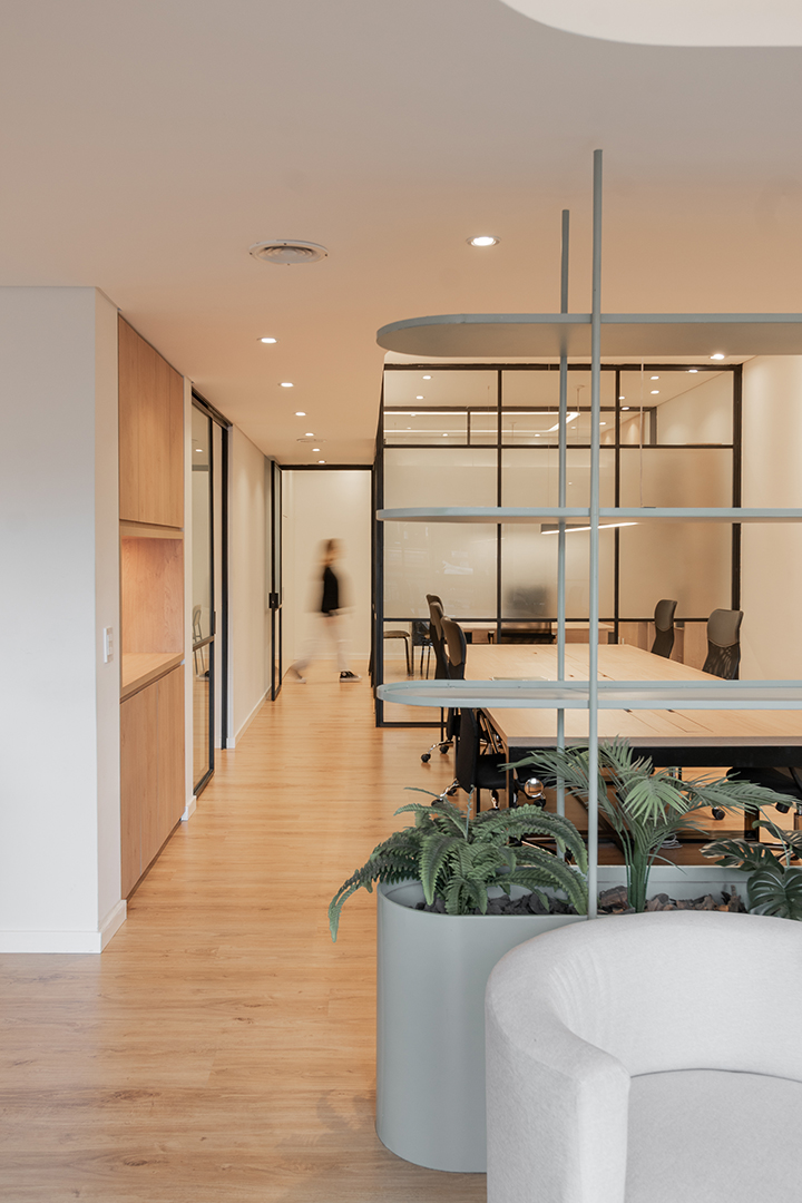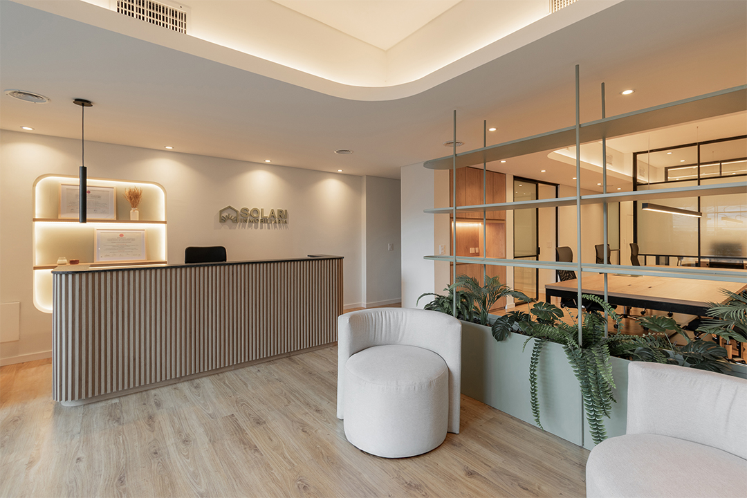 El proyecto se ubica en Pellegrini y Sarmiento, en un local de 105 m² que durante años funcionó como espacio gastronómico. La decisión principal fue vaciarlo por completo, conservando únicamente los muros de mampostería para generar un ambiente abierto y flexible. El acceso desde la calle conduce a una recepción, separada del área central mediante un mobiliario de chapa diseñado para dividir sin cortar la fluidez visual. En este sector se dispusieron una oficina privada y una sala de reuniones, resueltas como volúmenes de vidrio que aseguran amplitud y continuidad. El diseño buscó un espacio abierto con máxima atención al detalle, equilibrando funcionalidad y estética para crear un ámbito eficiente, contemporáneo y acogedor.