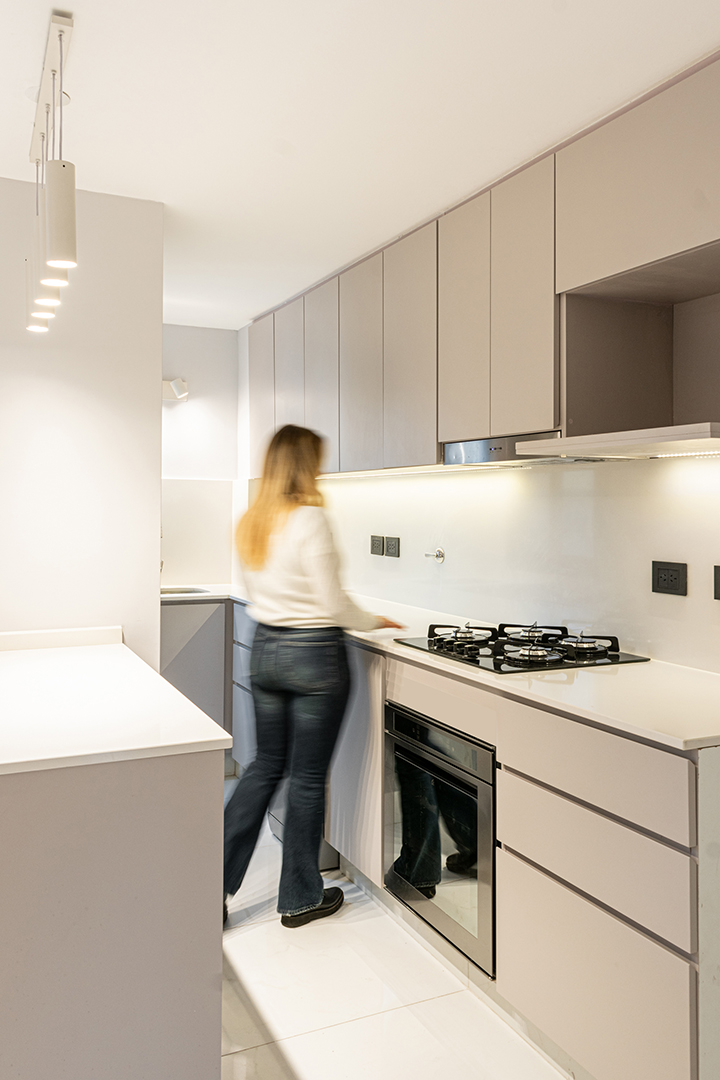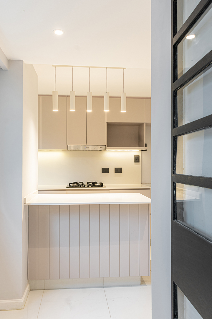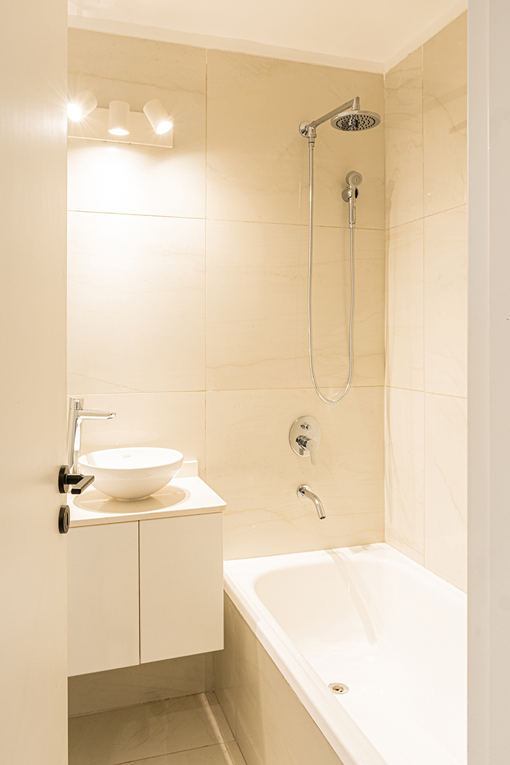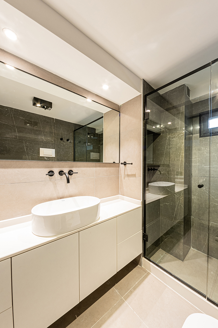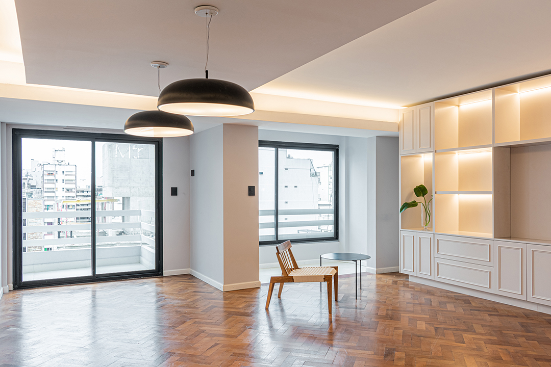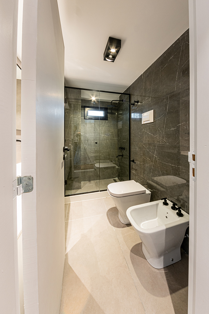 Reforma integral de un departamento de 130 m². La intervención abarcó todos los espacios, renovando instalaciones, carpinterías y revestimientos, e incorporando una nueva iluminación que potencia la amplitud y la luz natural. La cocina se redefinió con líneas simples y una paleta neutra, mientras que en el estar un mueble a medida organiza y aporta calidez. Los baños se transformaron por completo, priorizando la pureza formal y la continuidad visual. Cada ambiente fue pensado para lograr una estética coherente, contemporánea y atemporal.