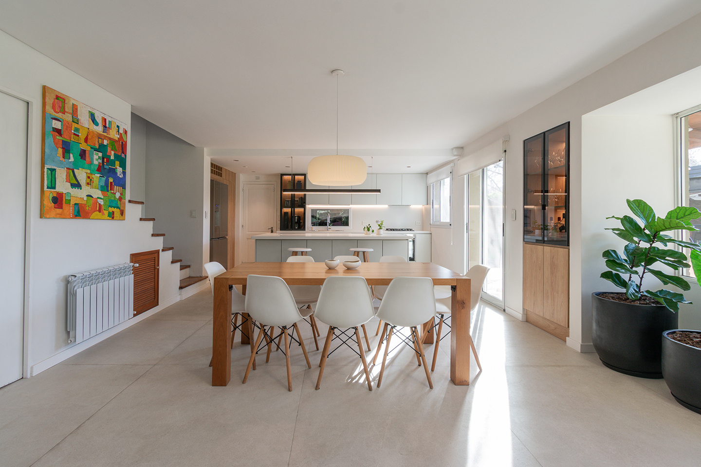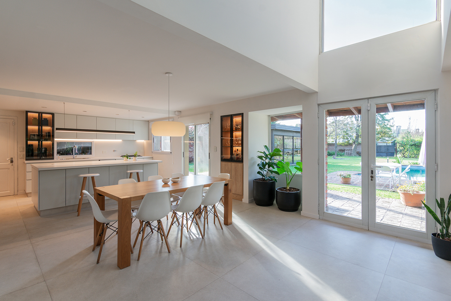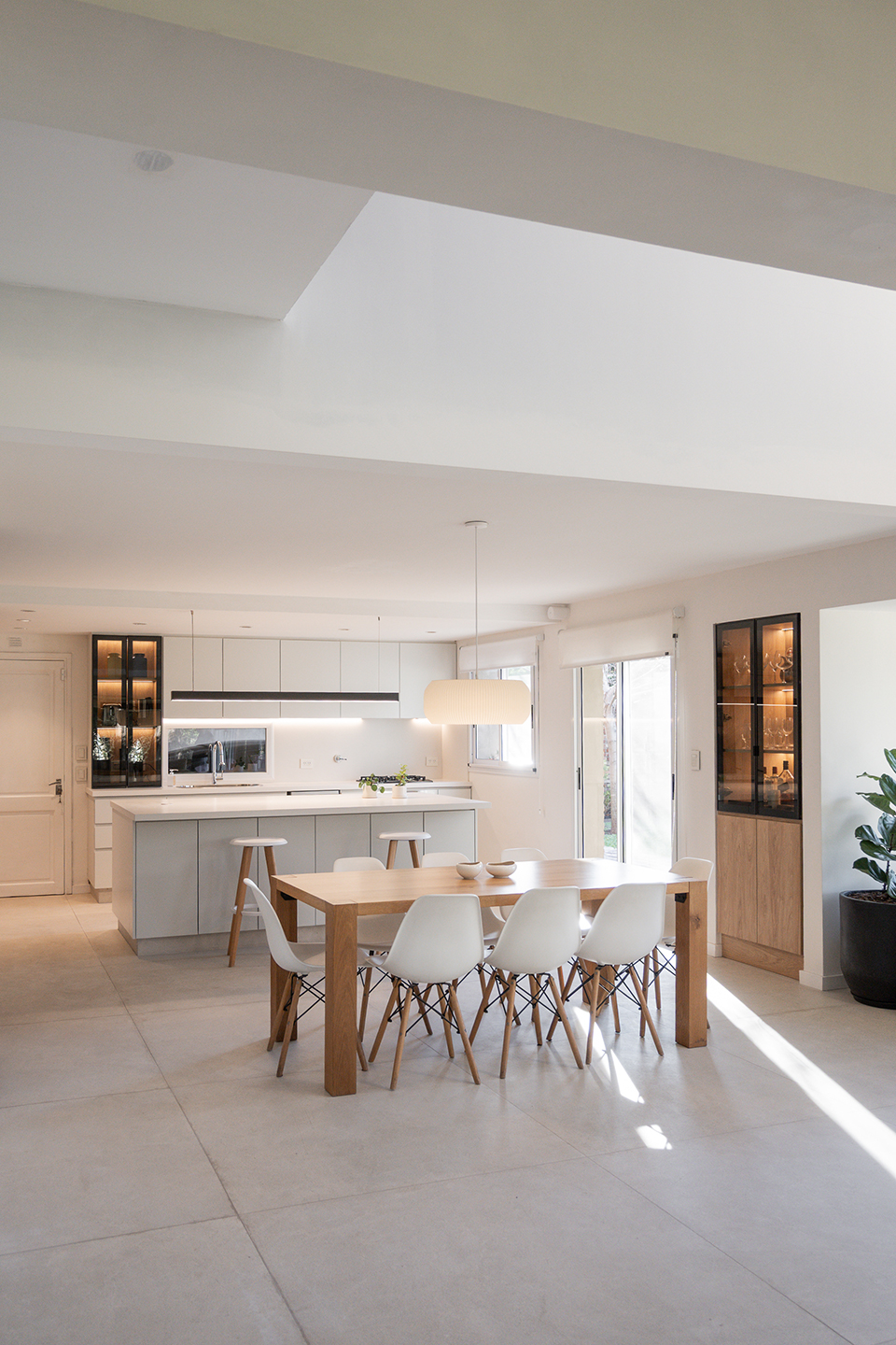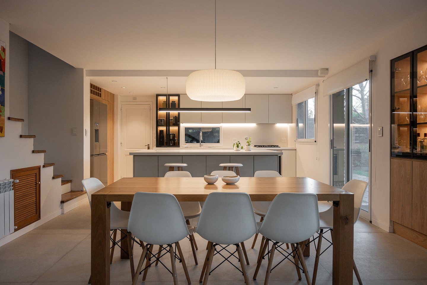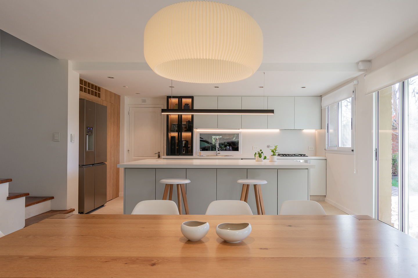 En esta vivienda, originalmente habitada por una familia de cinco integrantes, actualmente residen únicamente los padres. Este cambio en la dinámica familiar motivó la necesidad de replantear los espacios. La casa presentaba una organización fragmentada, con la cocina, el comedor y el living separados por muros divisorios. La propuesta de reforma consiste en eliminar estas paredes para generar un único ambiente integrado, donde la cocina se convierte en el verdadero corazón del hogar, articulando las áreas sociales y potenciando la vida cotidiana en un espacio amplio, luminoso y unificado.