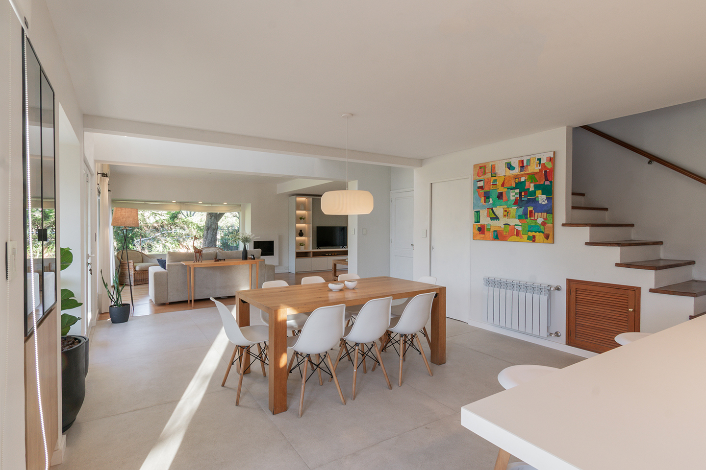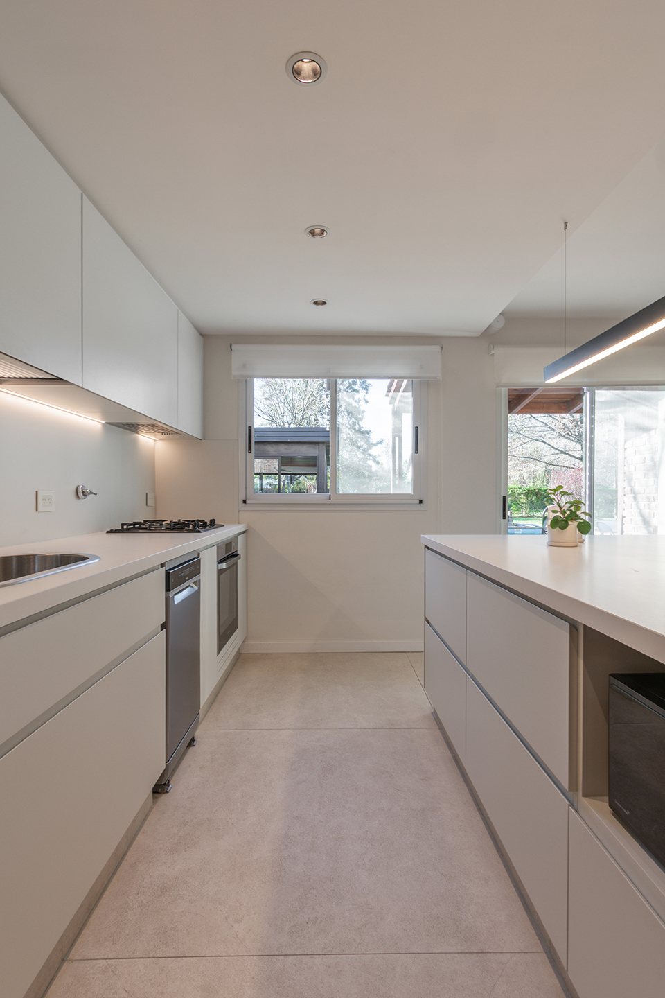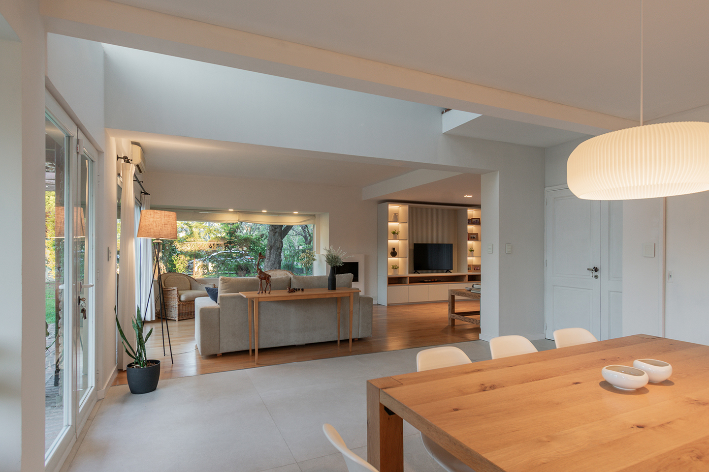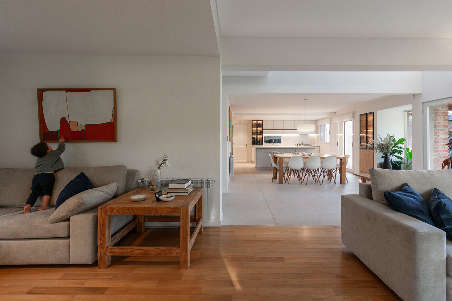En esta vivienda, originalmente habitada por una familia de cinco integrantes, actualmente residen únicamente los padres. Este cambio en la dinámica familiar motivó la necesidad de replantear los espacios. La casa presentaba una organización fragmentada, con la cocina, el comedor y el living separados por muros divisorios. La propuesta de reforma consiste en eliminar estas paredes para generar un único ambiente integrado, donde la cocina se convierte en el verdadero corazón del hogar, articulando las áreas sociales y potenciando la vida cotidiana en un espacio amplio, luminoso y unificado.